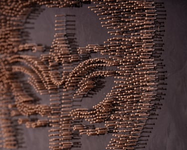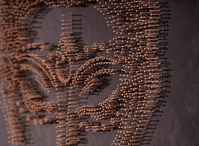 Clous minutieusement plantés sur bois ou résine, chaque pointe participe à la construction d’un mouvement. Selon l’angle et la lumière, l’œuvre se transforme, entre flou et précision, pour offrir une expérience visuelle unique.