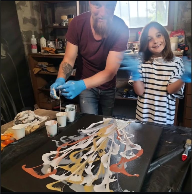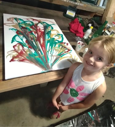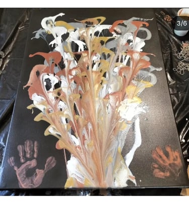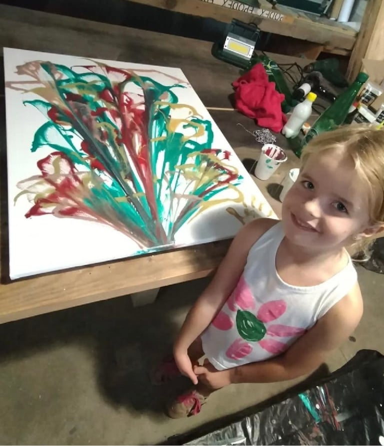 1ère création pour Lilou. Après avoir choisi les couleurs qui lui plaisait, présentation de la technique des chaînes à billes, préparation de la toile et des pots de couleurs pour finir pas l'application du geste qui donne ce rendu final