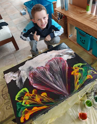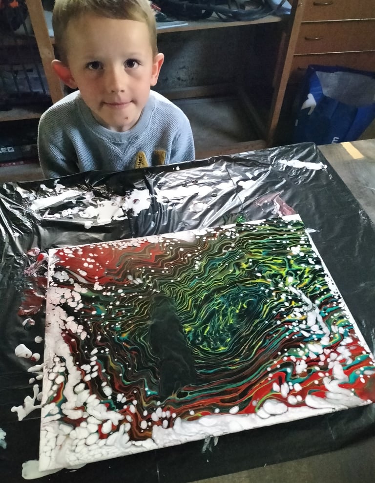 1ère création pour Jules sur du pouring avec une simple superposition des couleurs et ensuite inclinaison de la toile pour que la peinture couvre toute la toile