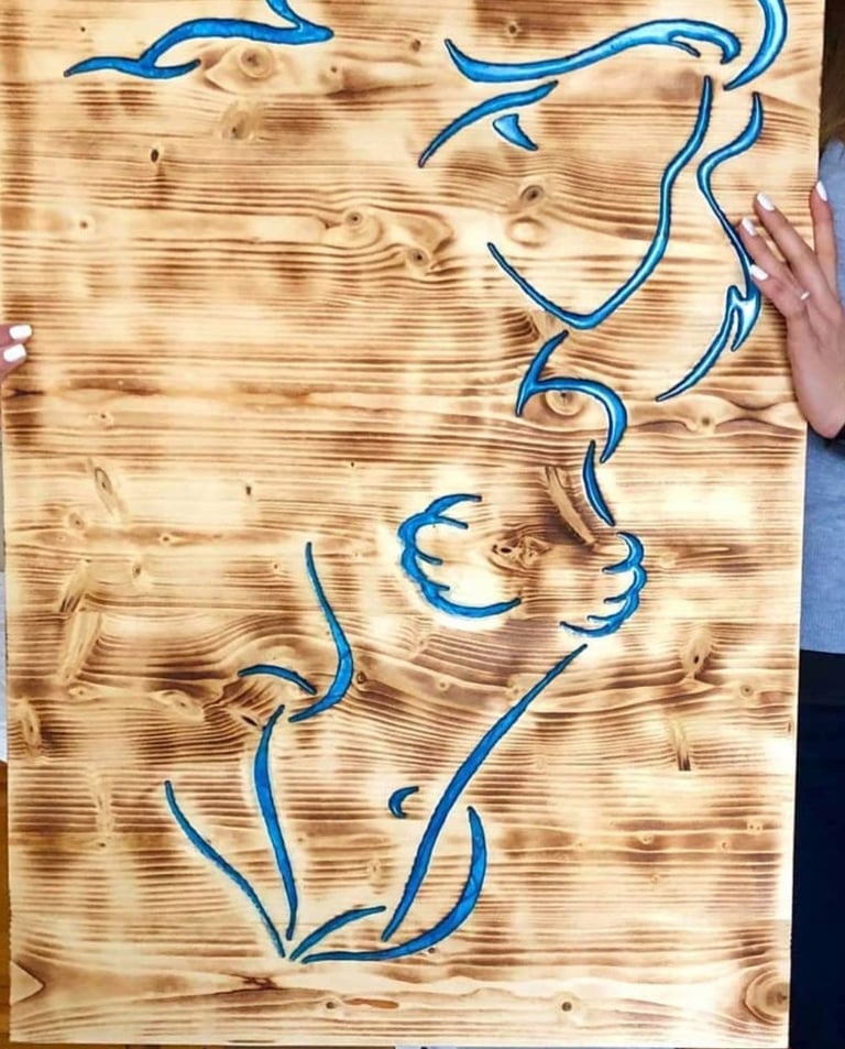 Line Art réalisé pour ma filleule qui aime les chevaux. Résine epoxy coulée dans du bois creusé au préalable