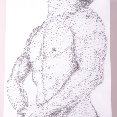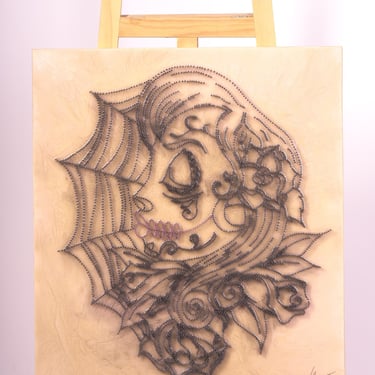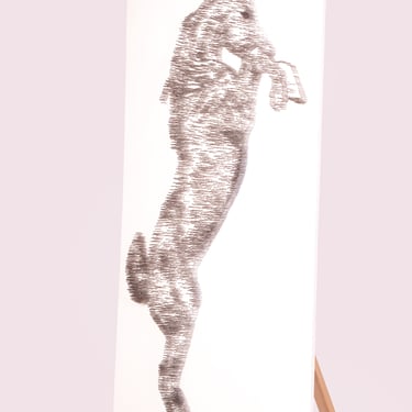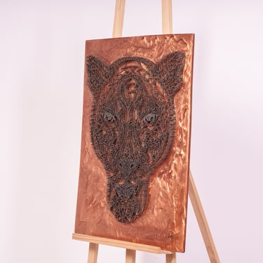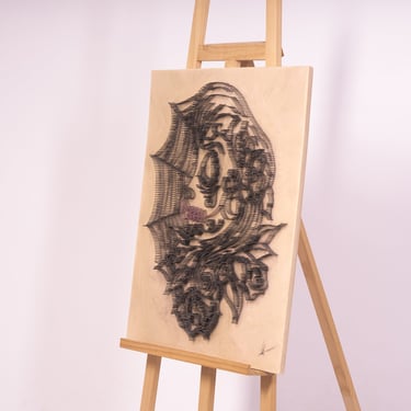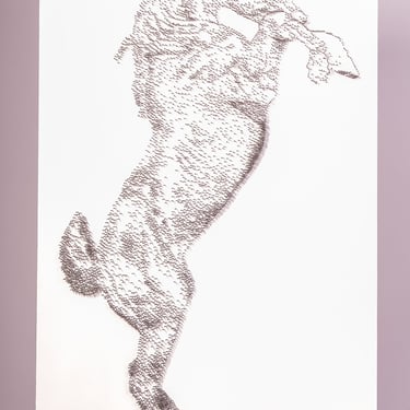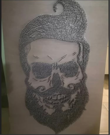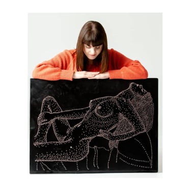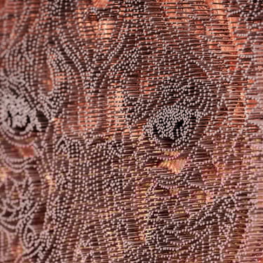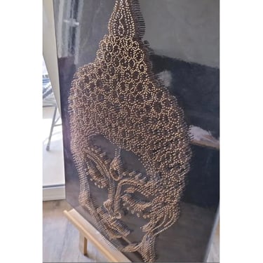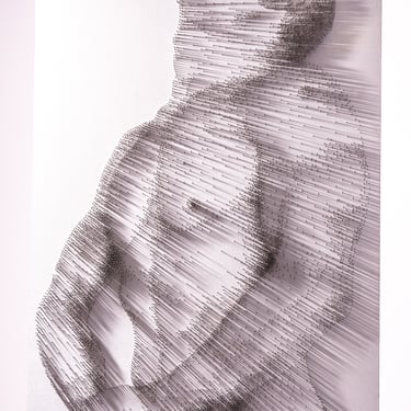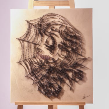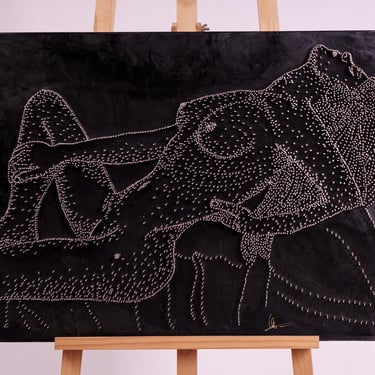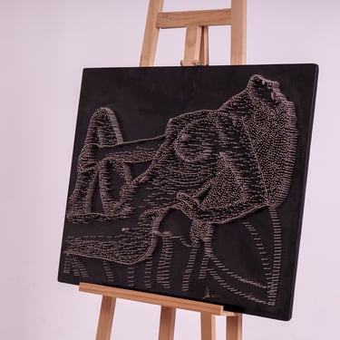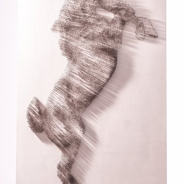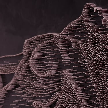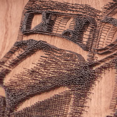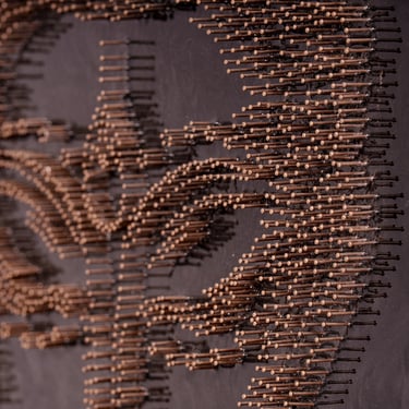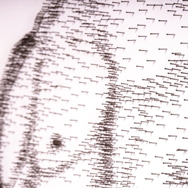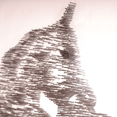 Sous forme de bas relief mural, pointillisme en clous métalliques volontairement laissés partiellement émergents jouent avec la lumière et la profondeur. Selon l'angle d'observation et la luminosité, la composition se transforme, oscillant entre présence graphique et vibration sculpturale.