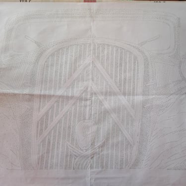 Dessin de la face avant d'une Citroën Traction. Le positionnement des clous est lancé. Une fois terminé il sera posé dans un cadre en cornières métalliques dans lequel sera coulée de la résine epoxy. Couleurs non encore définies.